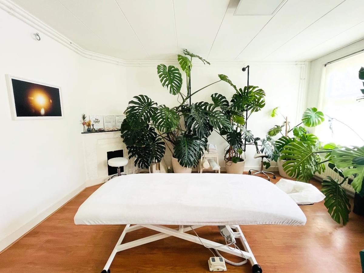 In the treatment room, a calm atmosphere and lush green plants welcome you with peaceful energy.
